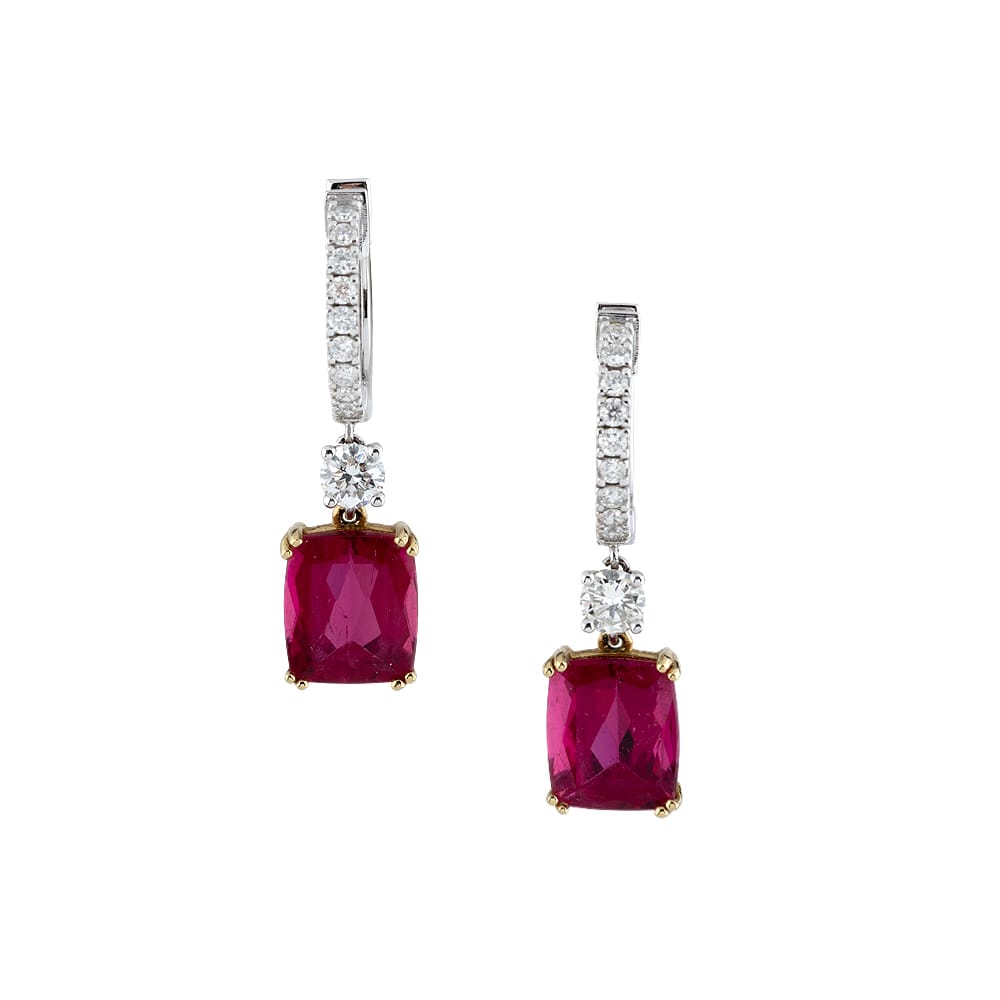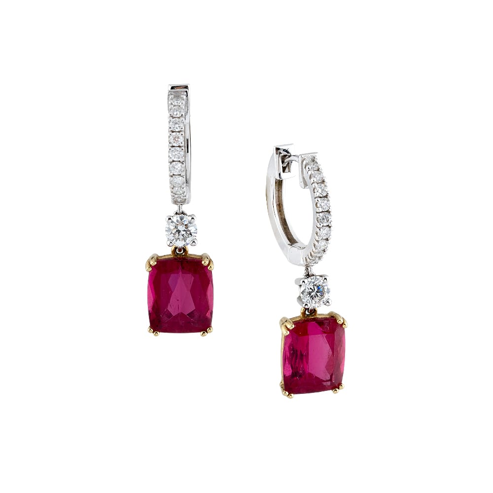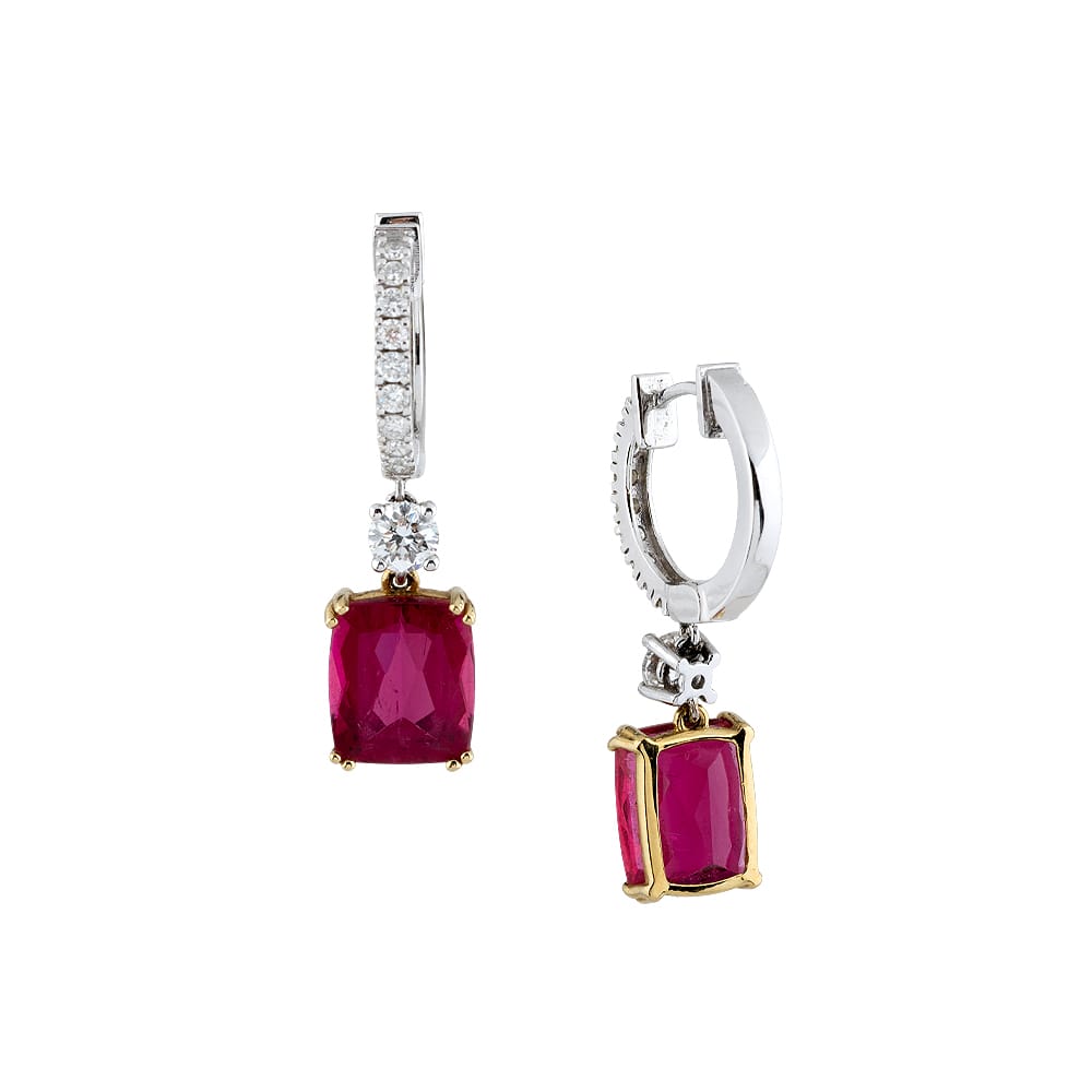 PENDIENTES DE ORO BLANCO Y AMARILLO CON 20 DIAMANTES TALLA BRILLANTES CON UN TOTAL DE 0.66 CT Y 2 RUBELITAS CON UN TOTAL DE 5.97CT