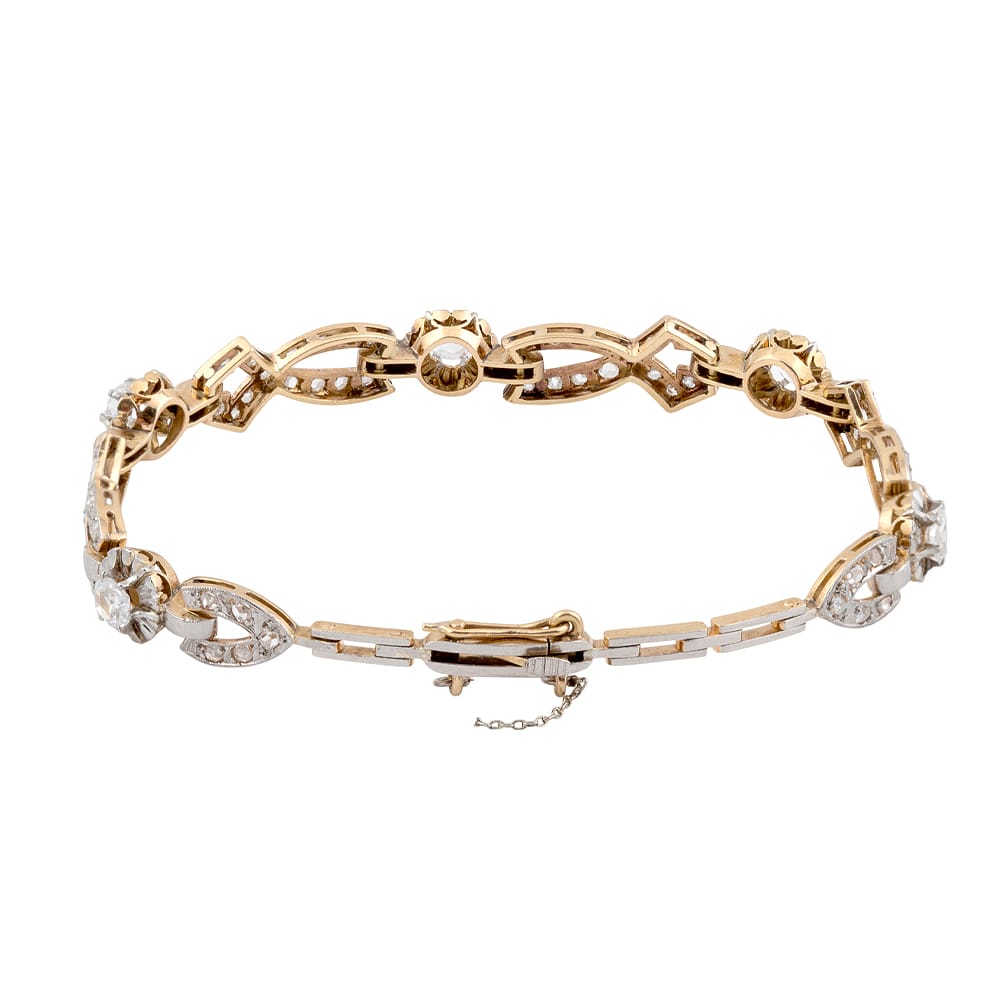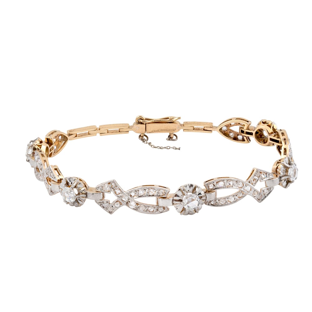 PULSERA ESTILO ARTDECO DE ORO AMARILLO CON VISTAS ORO BLANCO Y 5 + 64 DIAMANTES TALLA ROSA TOTAL 1.40CT COLOR I/J PUREZA SI/P BRILLANTES