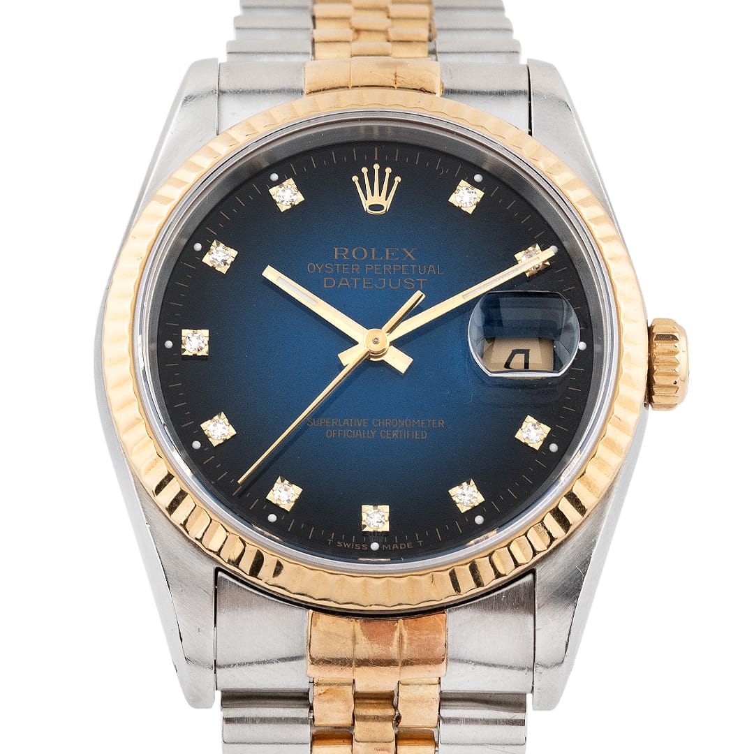 ROLEX AUTOMáTICO, CRISTAL DE ZAFIRO, FECHA, ESFERA DE DIAMANTE DEGRADE BLUE, REFERENCIA. 16233, NúMERO DE SERIE X513786, CAL 3135, PULSERA DE ANIVERSARIO ORIGINAL, 36 MM DE DIáMETRO, DEL AñO 94 CON DOCUMENTACIÓN